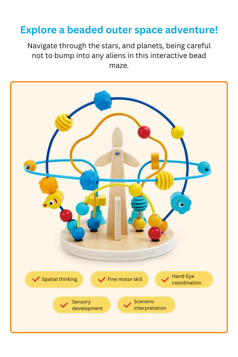 Explore a beaded outer space adventure! Navigate through the stars, and planets, being careful not to bump into any aliens in this interactive bead maze. As children navigate the beads through the maze, they`ll improve their hand-eye coordination and fine motor skills, plus, the mix of alien and planet beads offers an additional sensory treat.