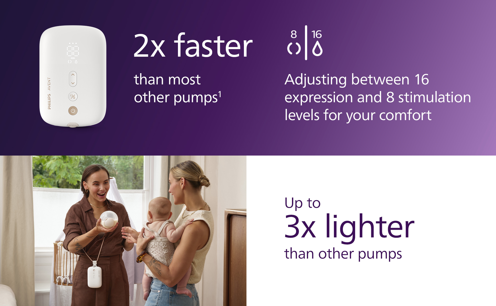 Babies know how to drink best! That’s why our hands-free electric breast pump mimics their natural drinking rhythm – so you can find your own rhythm for effective* expression and optimal milk output. Pumping up to 85 times per minute, the Philips Avent Hands-free Breast Pump is 2x faster than most other pumps**.