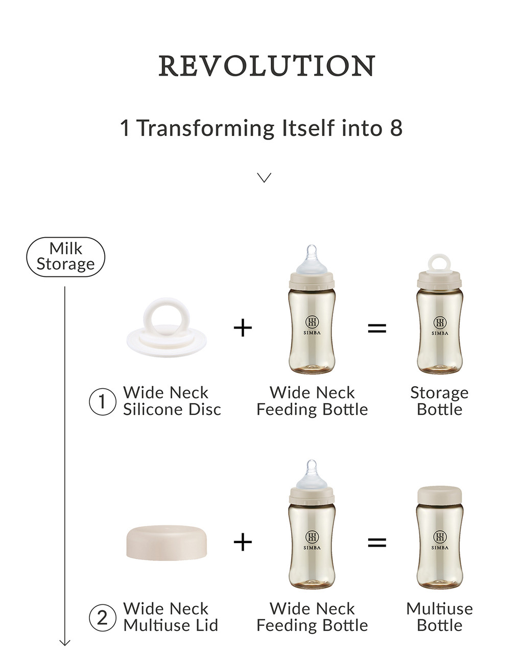 ● Pioneering! 1 Transforming Itself into 8 - Simply change the upper parts according to the need for milk storage, feeding or learning at every stage of nursing the baby.