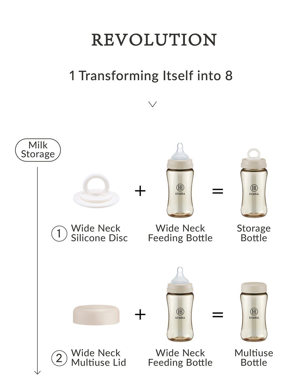 ● Pioneering! 1 Transforming Itself into 8 - Simply change the upper parts according to the need for milk storage, feeding or learning at every stage of nursing the baby.