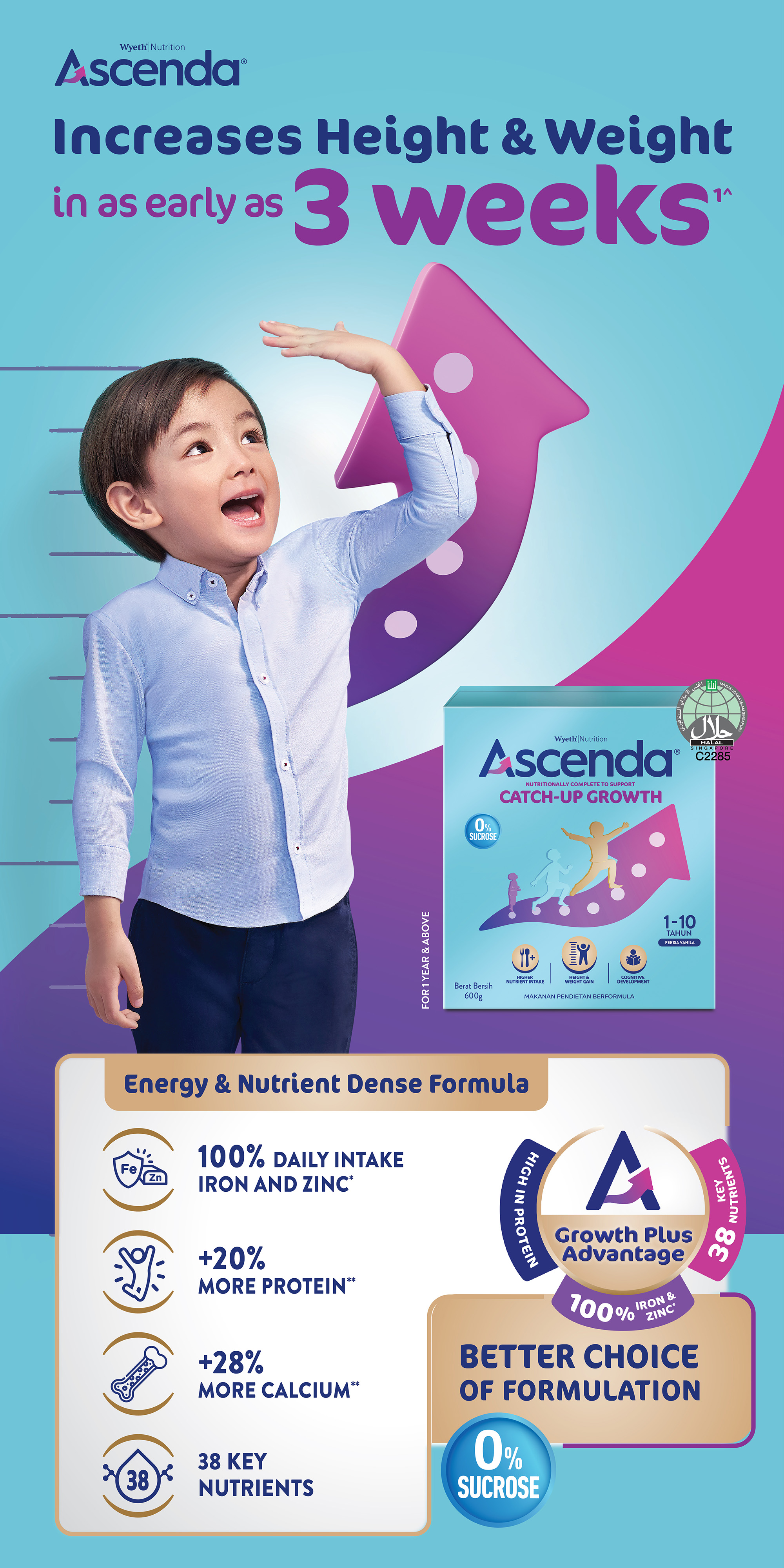 ASCENDA® dengan ""Growth Plus Advantage"" dapat membantu meningkatkan ketinggian dan berat badan seawal 3 mingggu1^