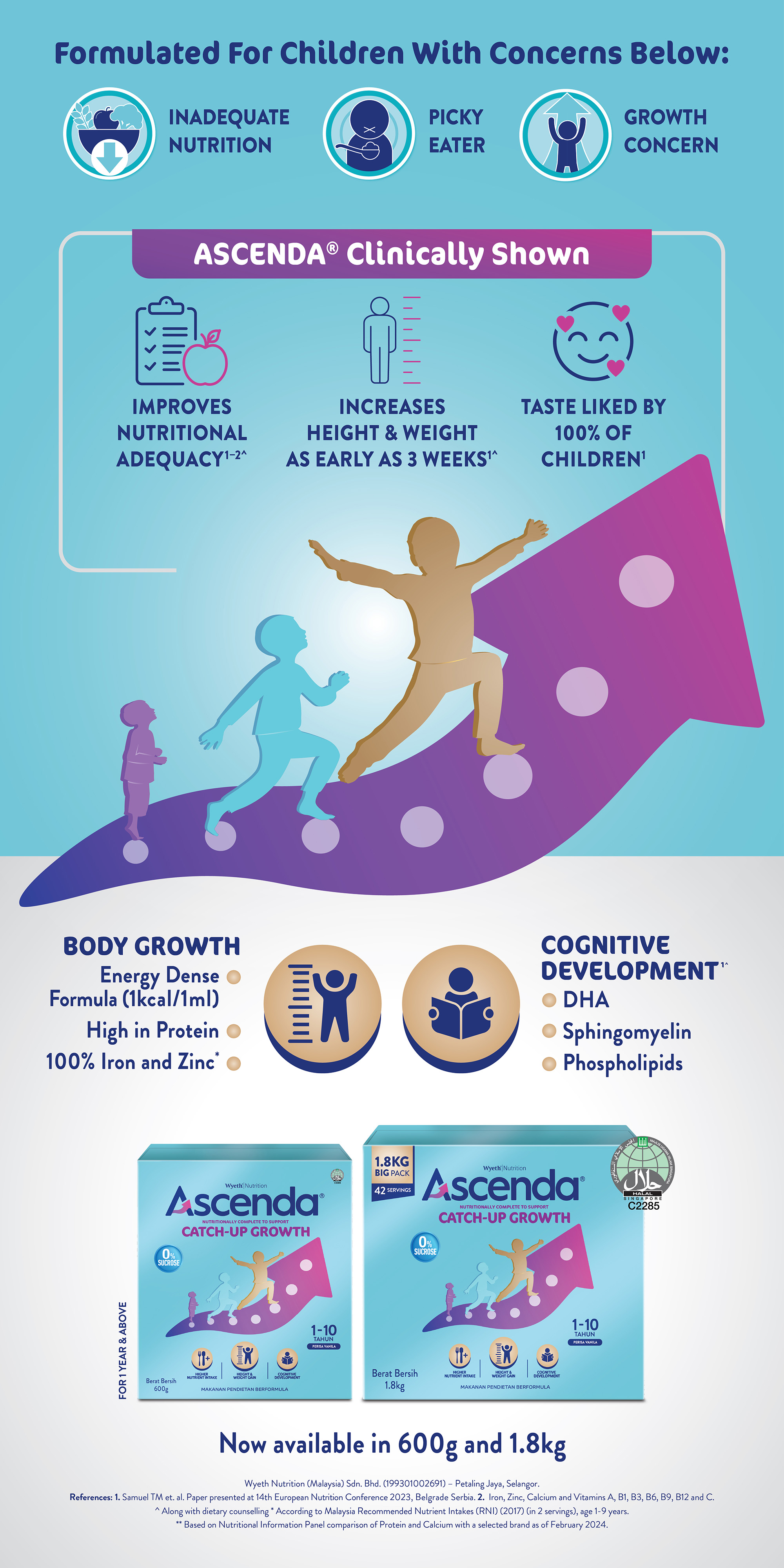 "ASCENDA® is a nutritionally complete formula to support catch-up growth to those who are experiencing growth concerns such as failure to thrive, inadequate nutrition and picky eating. ASCENDA® is scientifically formulated to support the increases of height and weight. Make ASCENDA® part of your child's routine to help them catch-up on growth.