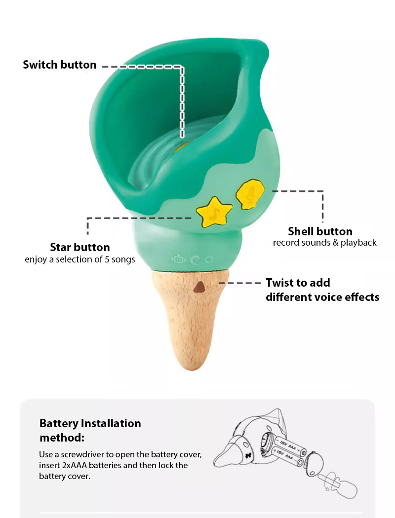 Experience the enchanting sounds of the sea with our Magic Music Conch toy. Record your own sounds or listen to the melodies as the conch shell sings. Press the Star button to enjoy a selection of five songs. Alternatively, hold down the Shell button to capture your voice recordings. You can even rotate the base of the conch to morph its sound into various playful versions like robots, ocean waves, or bubbles.