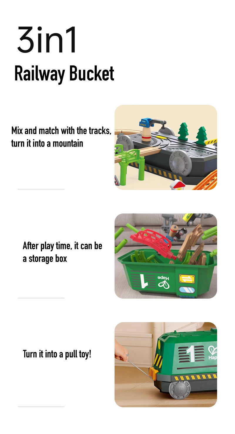 Innovative Storage Design: Train-shaped bucket doubles as part of the play world and a convenient storage solution
