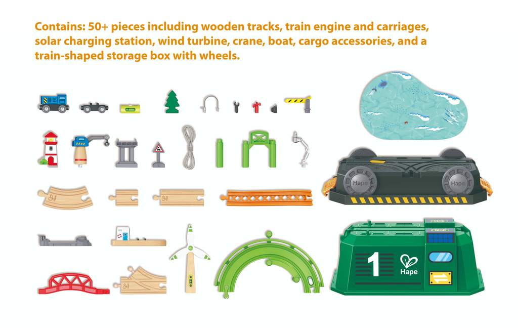 Contains: 50+ pieces including wooden tracks, train engine and carriages, solar charging station, wind turbine, crane, boat, cargo accessories, and a train-shaped storage box with wheels